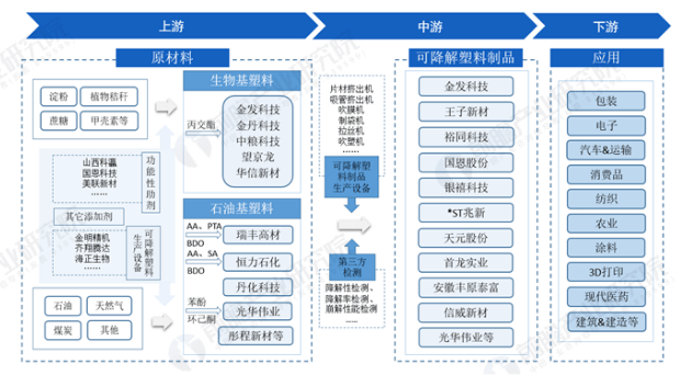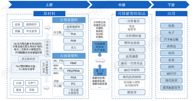 產業(yè)鏈下游為可降解塑料的應用,涉及領域包括包裝、電子、汽車&運輸、消費品、紡織、農業(yè)、涂料、3D打印、現(xiàn)代醫(yī)藥、建筑&建造等。