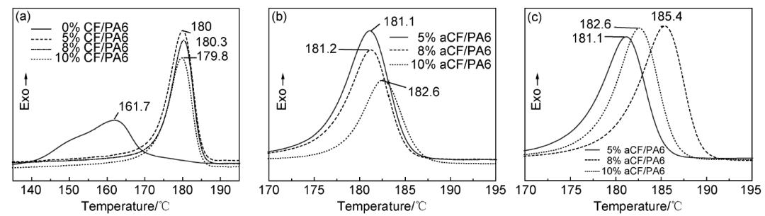 圖6是不同方法處理的CF/PA6復(fù)合材料的降溫結(jié)晶曲線。純PA6結(jié)晶峰溫度為161.7 ℃,加入不同比例CF后,其結(jié)晶峰向高溫方向移動,峰變窄,這表明復(fù)合材料內(nèi)部晶片變厚且均勻;結(jié)晶溫度區(qū)間大幅減小,說明加入CF后,大大促進了PA6的結(jié)晶速率,且使其結(jié)晶更加均勻、完善。經(jīng)過改性處理后的aCF,sCF復(fù)合材料(圖6(b),(c))則獲得更高的結(jié)晶溫度,未處理CF/PA6的結(jié)晶溫度約為180 ℃, aCF/PA6結(jié)晶溫度范圍在181~182 ℃,sCF/PA6的結(jié)晶溫度范圍達181~185 ℃。
