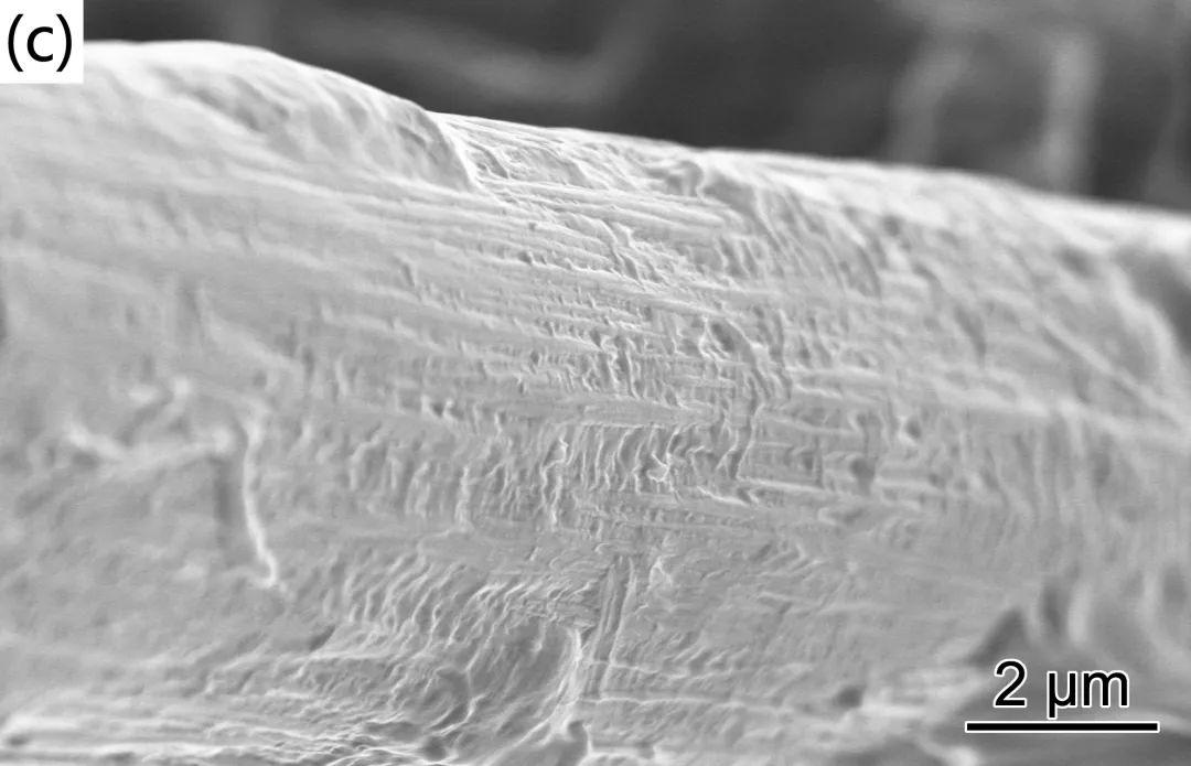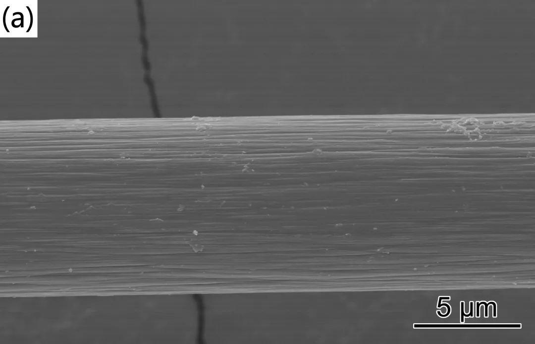圖1是原始CF、酸化處理后的CF(aCF)、上漿處理后的CF(sCF)的SEM照片??梢钥闯觯糃F(圖1(a))表面具有沿纖維軸向排列的溝槽。經(jīng)酸化處理后的aCF(圖1(b))表面粗糙度增加,縱向溝槽更加明顯。上漿處理后的sCF(圖1(c))除了沿纖維軸向的溝槽外,纖維表面還出現(xiàn)了大量褶皺,這表明經(jīng)上漿處理后,纖維表面包覆了一層連續(xù)的PA6薄膜覆蓋層。
